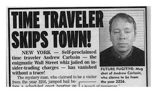 Konon di tahun 2003, seorang pialang bernama Andrew Carlssin melakukan 126 aksi jual-beli saham beresiko tinggi dan semua sukses menghasilkan keuntungan, meningkatkan dananya dari $800 menjadi $350 juta hanya dalam 2 minggu. Hal ini mengusik perhatian SEC (U.S. Securities and Exchange Commission) dan FBI, yang kemudian menangkapnya. Dalam pengakuan selama 4 jam, pria 44 tahun ini kemudian mengaku datang dari masa 200 tahun yang akan datang. Carlssin kemudian menukarkan informasi keberadaan Bin Landen dan obat anti AIDS sebagai ganti pembebasannya, meski ia menolak memberitahu lokasi mesin waktunya. Benarkah kisah ini?